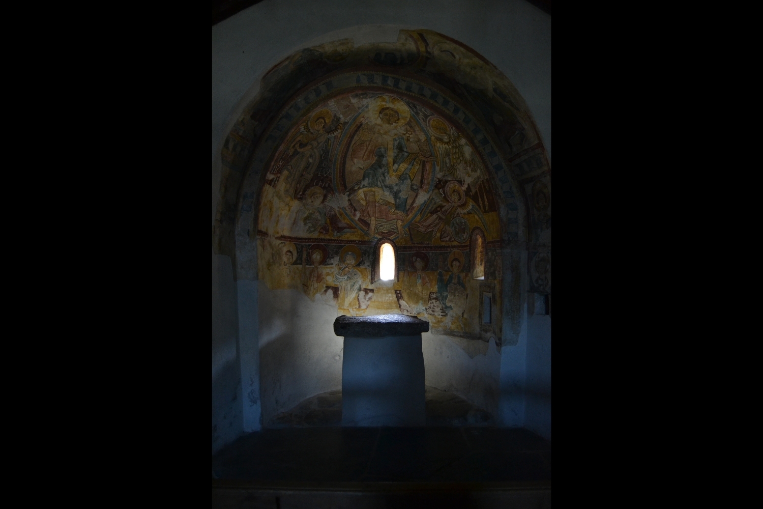 Inside, the church houses a reproduction of its original Romanesque murals, now preserved in the MNAC. These paintings depict an imposing scene of Christ in majesty, surrounded by the tetramorph, with particularly interesting iconography: the Archangel St. Michael appears fused with the symbol of St. Matthew, an unusual representation that lends a uniqueness to the ensemble.