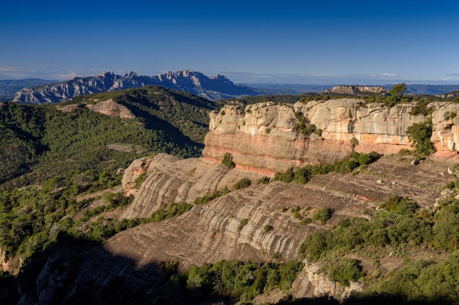 Once at the top, we enjoy a wide panoramic view of Central Catalonia and the Pyrenees. The mountain of Montserrat looks perfect and, at the bottom of the plan, the city of Manresa. Higher up, the foothills of the Pyrenees and the Berguedà Pre-Pyrenees. You can also see the Montseny Massif and, just to the south, the hermitage of Sant Llorenç del Munt stands out from the mountain. With the compass rose at the top, we will help to locate all these geographical elements.