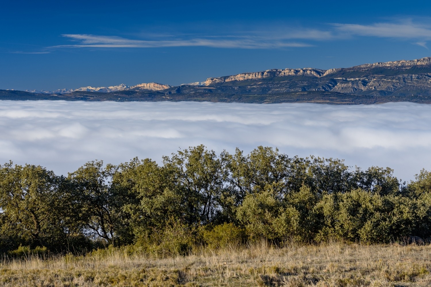 We will see that the path goes further inside the ridge but that it can also be climbed closer to the cliff since the terrain is quite open. From the top, we can see the entire interior sea of fog, as well as the mountains of the Cordillera Prelitoral and Montserrat (if the day is clear). Towards the other side, Montsec and some emblematic peaks of the Pyrenees, such as Monte Perdido.