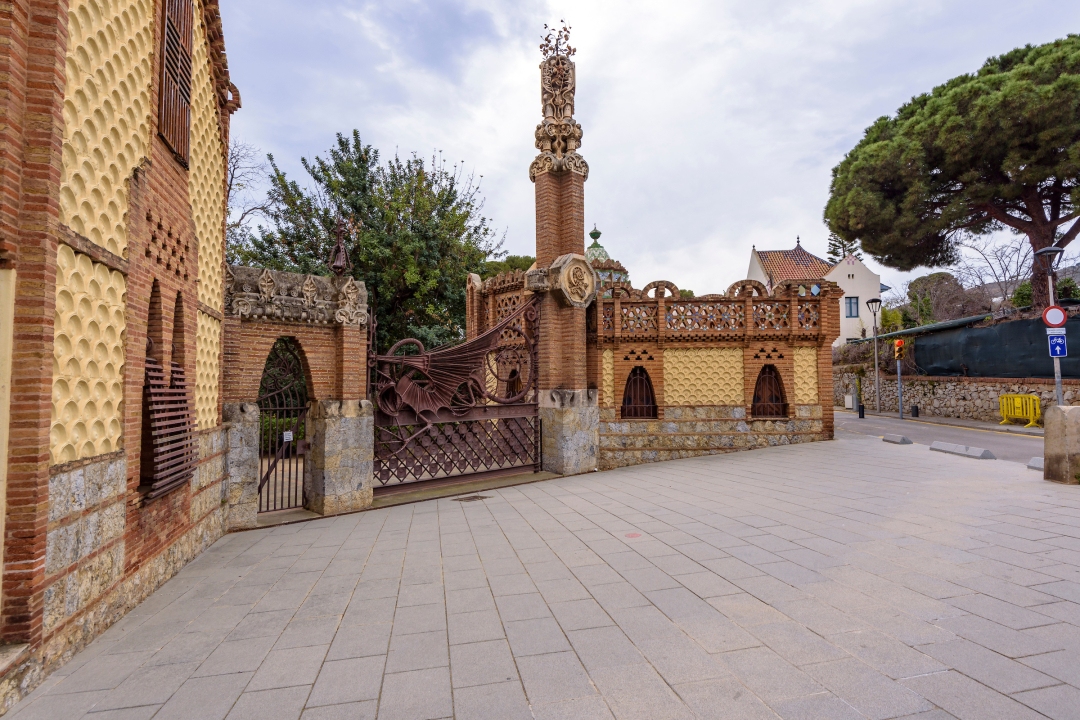 We now move to Paseo Manuel Girona, 55-57, where at the entrance of a residential area in the upper part of the city, is the street of the old Finca Miralles (1901-1902). Its wavy shape, its cover of broken ceramic pieces and the four-armed cross made of wrought iron, make this place unmistakably Gaudí 's.