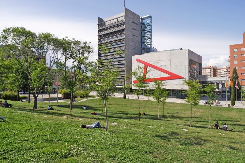 This façade looks towards the Plaza de Pau Casals, a beautiful torn green square.