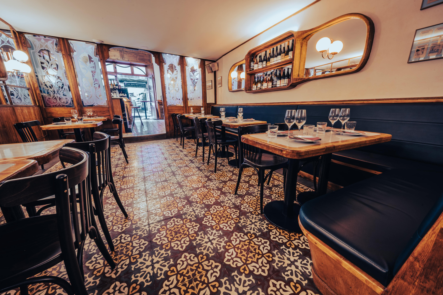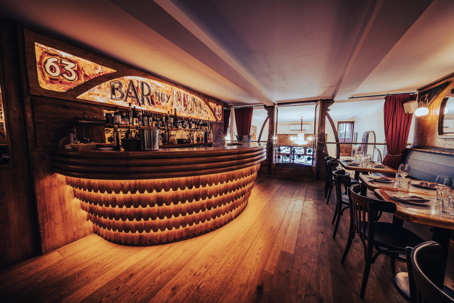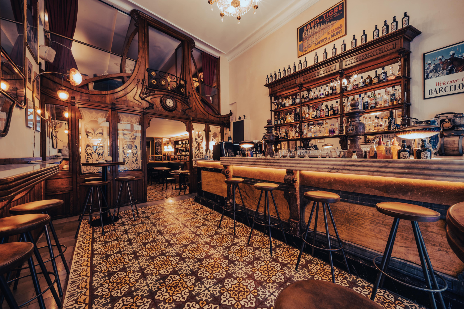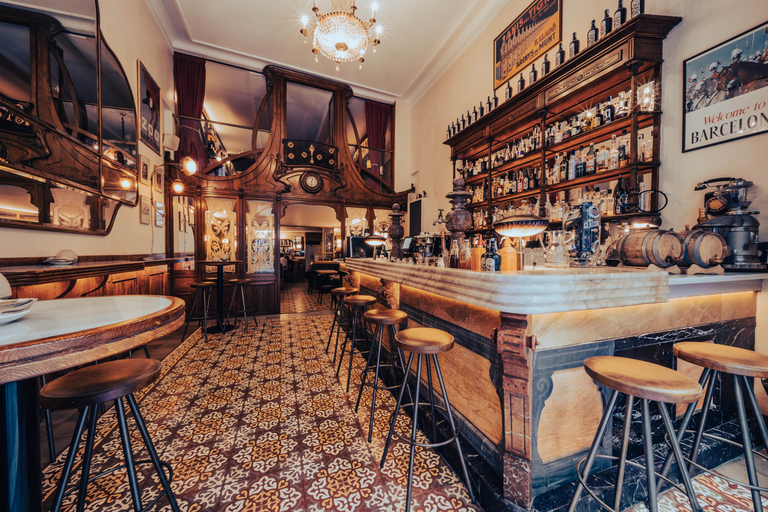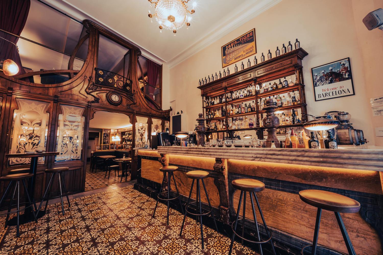 Desde el primer momento en que se entra, el Muy Buenas transmite una sensación poco habitual en la ciudad: la de coherencia entre forma y fondo. La reciente rehabilitación ha recuperado con precisión artesanal los elementos modernistas originales del local. La barra, la fachada, el reloj antiguo de la sala... Todo ha sido restaurado con un cuidado meticuloso, devolviéndole el carácter que tuvo hace casi un siglo.