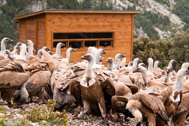 Los PAS (puntos de alimentación suplementaria) de la reserva son los primeros de Europa de alimentar los cuatro buitres del continente: el alimoche, el buitre leonado, el buitre negro y el quebrantahuesos.