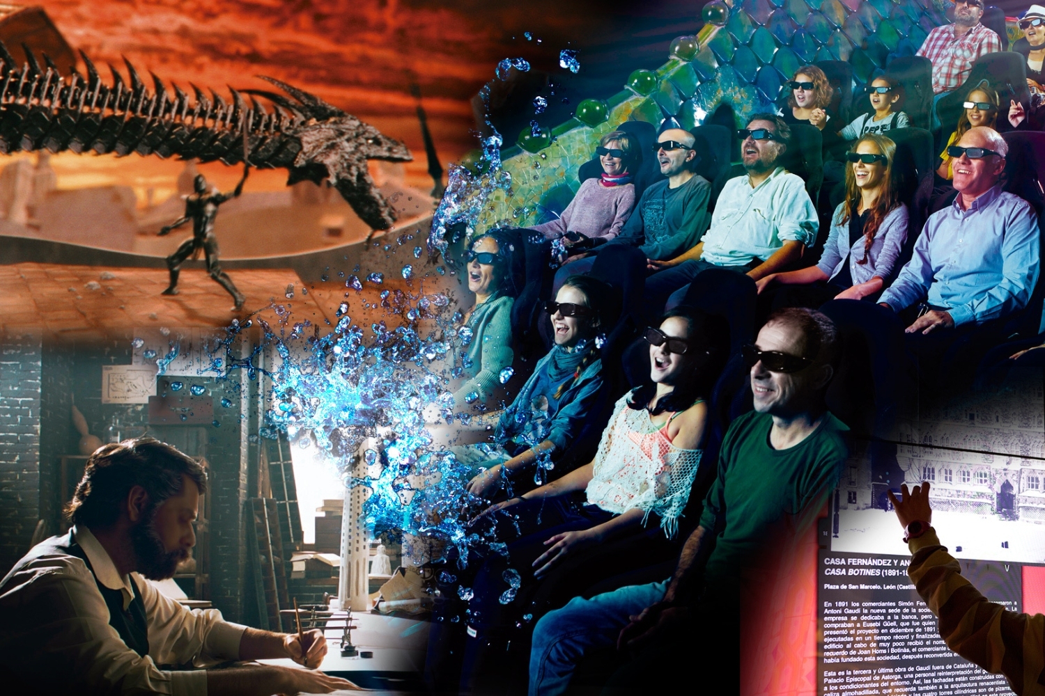 - Realidad Aumentada y Audiovisuales 4D: Interactúa con la pantalla inmersiva y siente cómo las obras de Gaudí cobran vida ante tus ojos. Mediante los audiovisuales en 4D y RA, sillones con movimiento y efectos, experimentarás en primera persona cómo la naturaleza inspiró su obra.