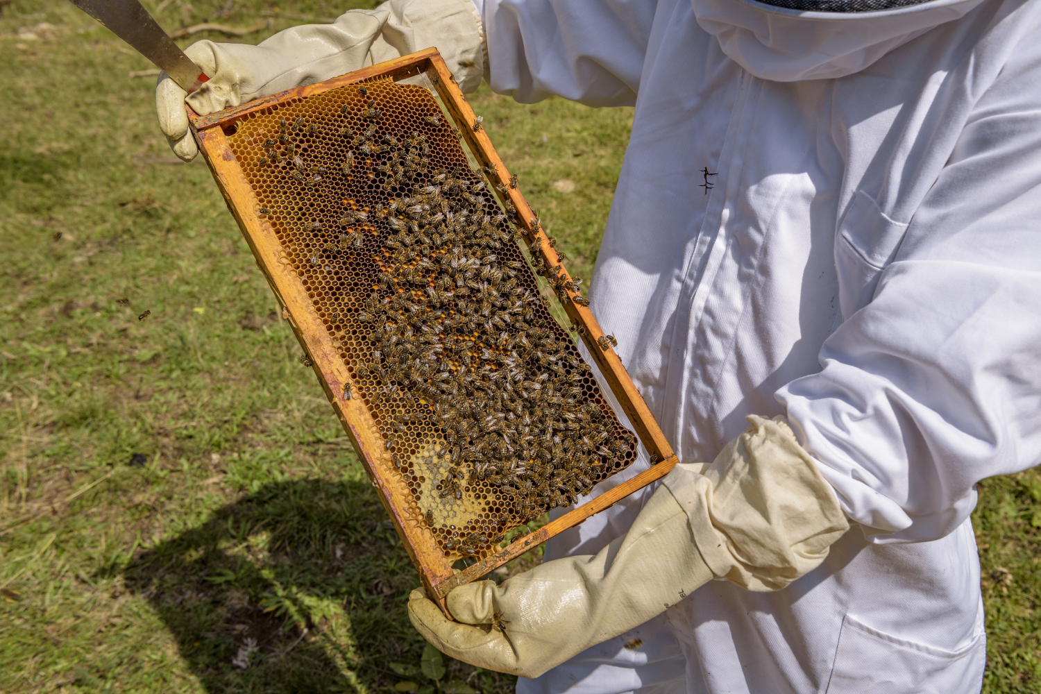 - Después te pondrás el traje, el sombrero y los guantes y ¡te rodearás de miles de abejas! Abriremos las cajas y descubrirás de primera mano la vida dentro de una colonia