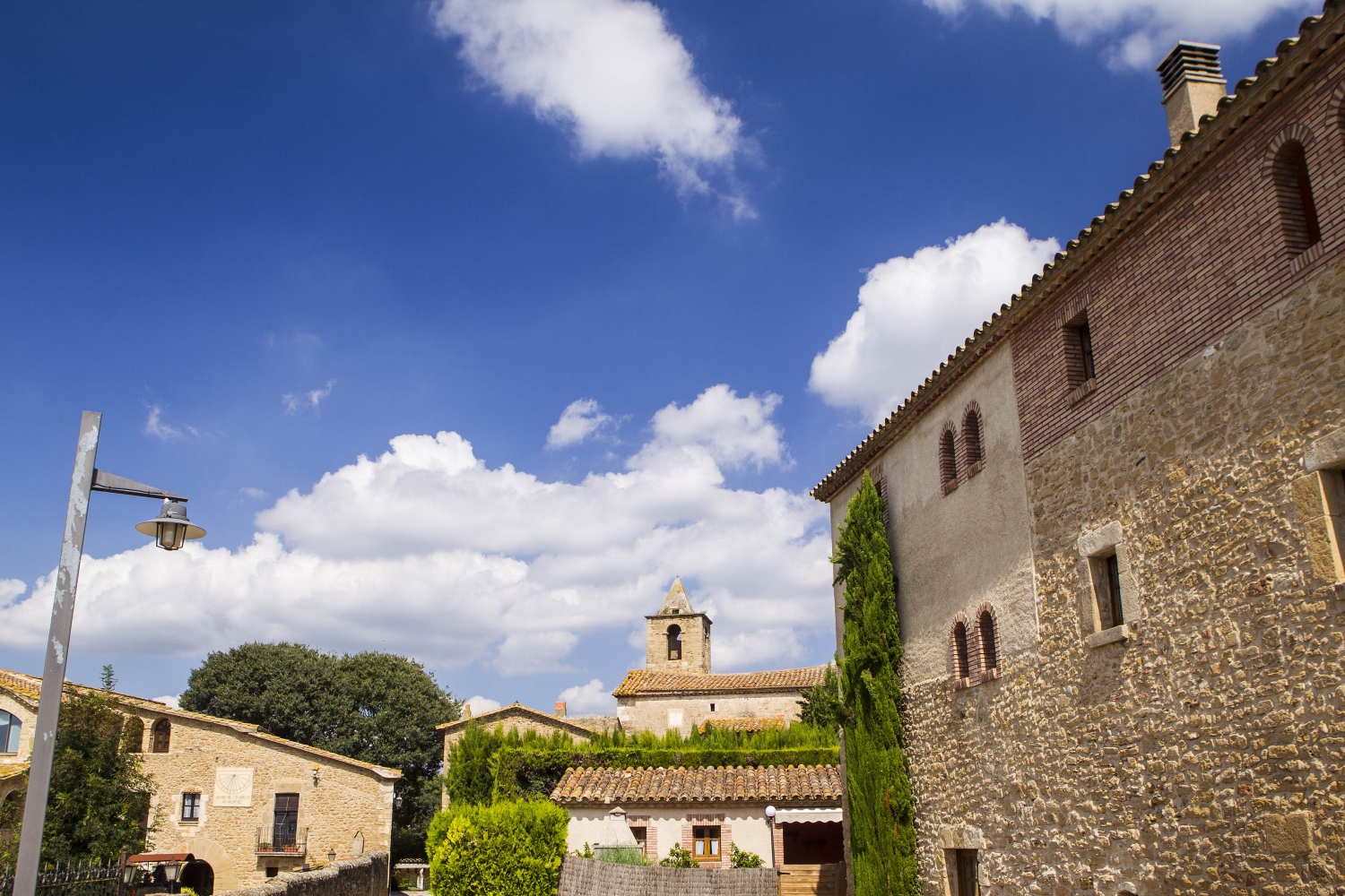 Está situado en la parte oriental de la comarca del Pla de l'Estany, sobre una pequeña colina llamada antiguamente Puig Blanquer, los lugares de interés más destacados son el castillo, la plaza mayor y la iglesia.