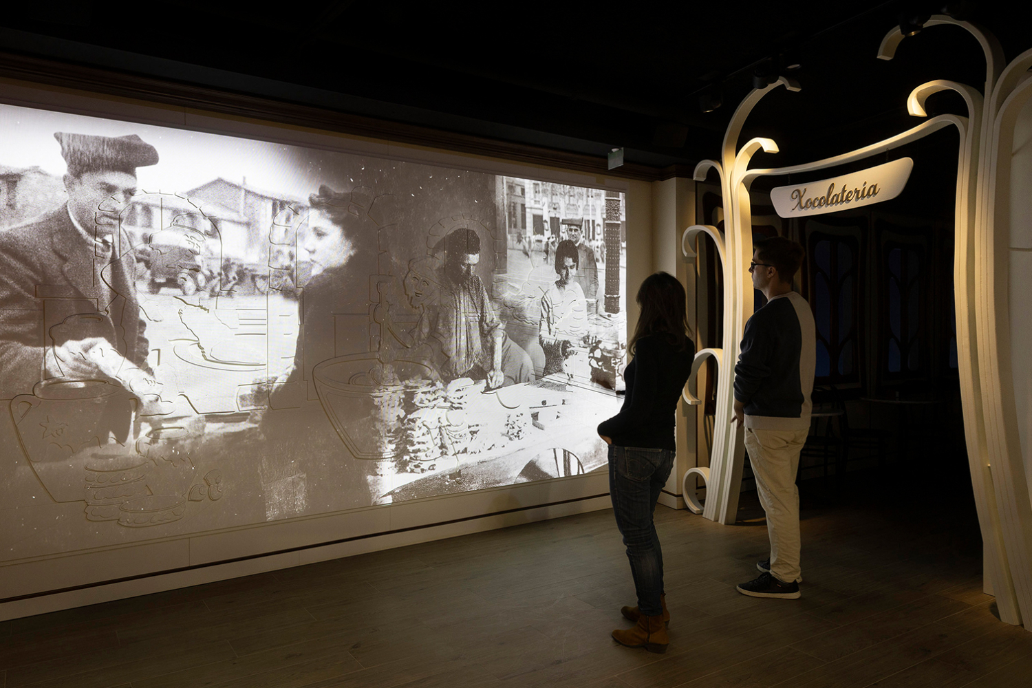 A special room recreates an early 20th-century chocolate shop, complete with wooden modernist-style windows projecting images of old Barcelona. The period furniture is remarkable, including a replica of a 300-year-old wooden fridge, and visitors can watch how an original mill was used to grind chocolate, with holograms that bring to life an 18th-century factory.