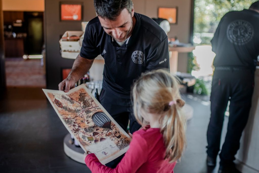 Ens trobem a les instal·lacions de Vol de Coloms, a tocar del volcà del Croscat, on tenim el camp d'enlairament. Podeu prendre un cafè i menjar unes pastes abans de volar en globus, mentre observeu, feu fotografies o ens ajudeu en la preparació del globus.