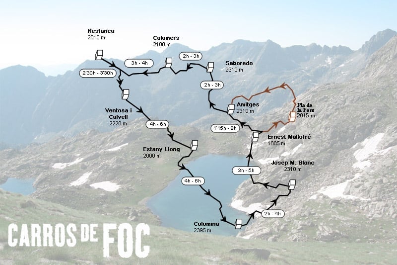Carros de Foc est un itinéraire de randonnée circulaire de 65 km et près de 9 200 mètres de dénivelé cumulé (en ajoutant le positif et le négatif), qui rejoint les neuf refuges gardés du Parc National d'Aigüestortes et Estany de Sant Maurici. Les altitudes du parcours varient entre 1 900 et 2 800 mètres.