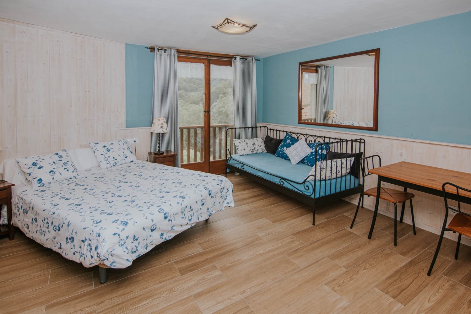 Ce est une chambre familiale qui dispose d'une chambre triple (lit double + lit simple) et une chambre double (lit double) deux communiqués, le partage d'une salle de bains avec douche.