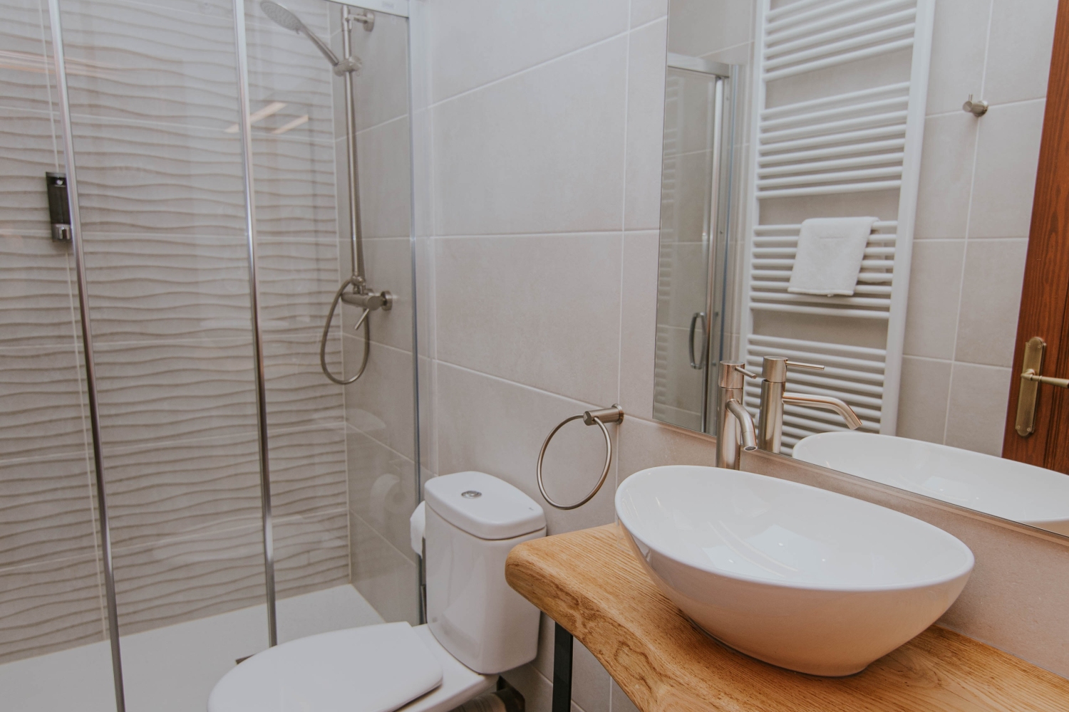 Ce est une chambre triple a un lit double et un lit simple, avec salle de bains avec une télévision douche, chauffage et à écran plat.