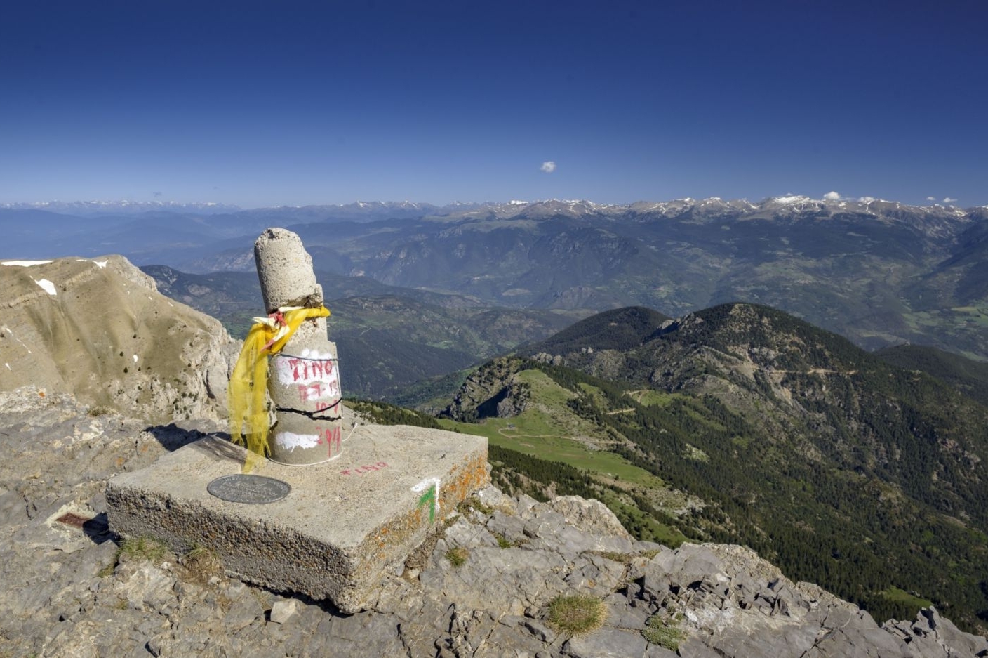 Environ 45-50 minutes plus tard, nous atteignons le sommet de Comabona, d'où nous profitons d'une large vue panoramique sur toute la Cerdagne, l'Alt Berguedà et certains des sommets du Ripollès et de la région d'Aigüestortes. Vous pouvez même voir Pica de Estados et Turbón, en Aragón si c'est une bonne journée.