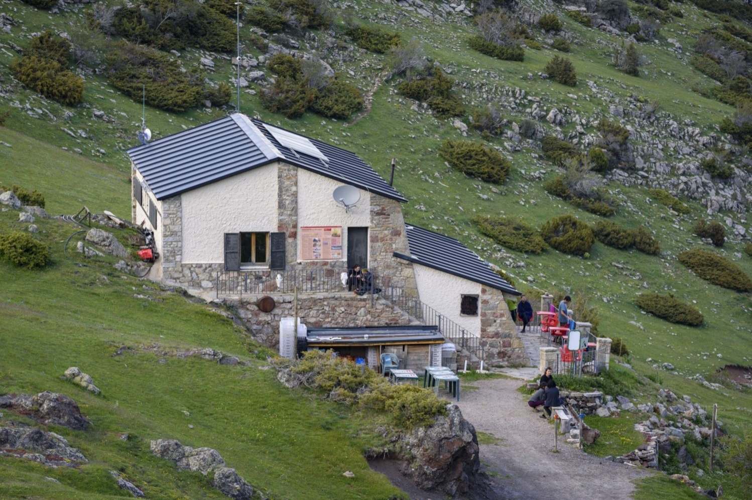 Déjà sur le petit parking avant le refuge, en moins de 10 minutes nous nous retrouverons devant le Refuge Prat de Aguiló. De ce point, nous prenons le chemin qui suit la route des Cavalls del Vent jusqu'au col des Gosolans. Dans cette section, nous trouverons à la fois les marques de points rouges des Cavalls del Vent et celles du PR-C 124 qui continue jusqu'à Saldes.