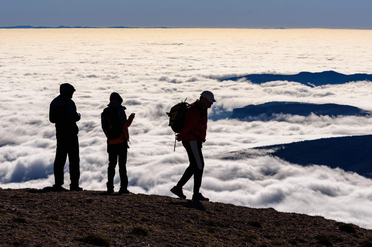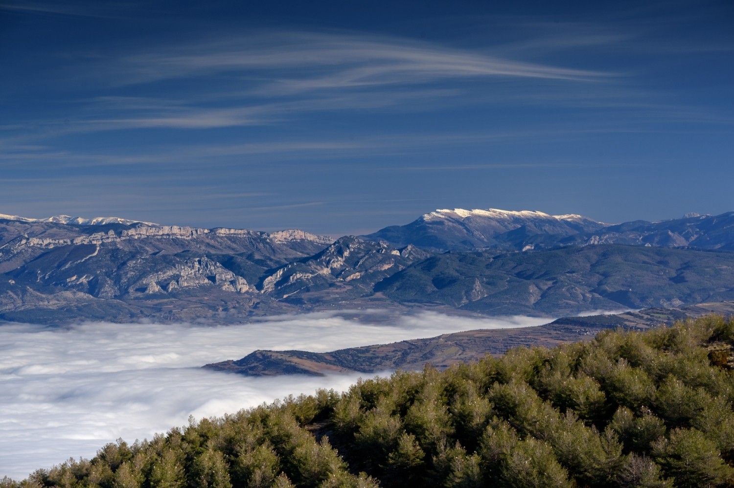 Nous descendons quelques mètres et nous retrouverons la piste au col du Ice Wells Pass. A partir de là, nous continuerons principalement par voie jusqu'au cou avant le sommet. Nous longeons le côté ombragé du Cap del Ras et, plus loin, nous arrivons à un petit cou. De ce point, nous empruntons une ancienne piste désaffectée qui nous laisse juste au sommet de Sant Alís. C'est une large colline d'où l'on profite d'une belle vue panoramique sur toute la chaîne de montagnes du Montsec, à l'exception de la plaine de Lleida et des Pyrénées. Par temps clair, nous distinguerons des endroits tels que Montserrat, Pedraforca (derrière), Pica de Estados, Aneto et Monte Perdido. Un vrai privilège.