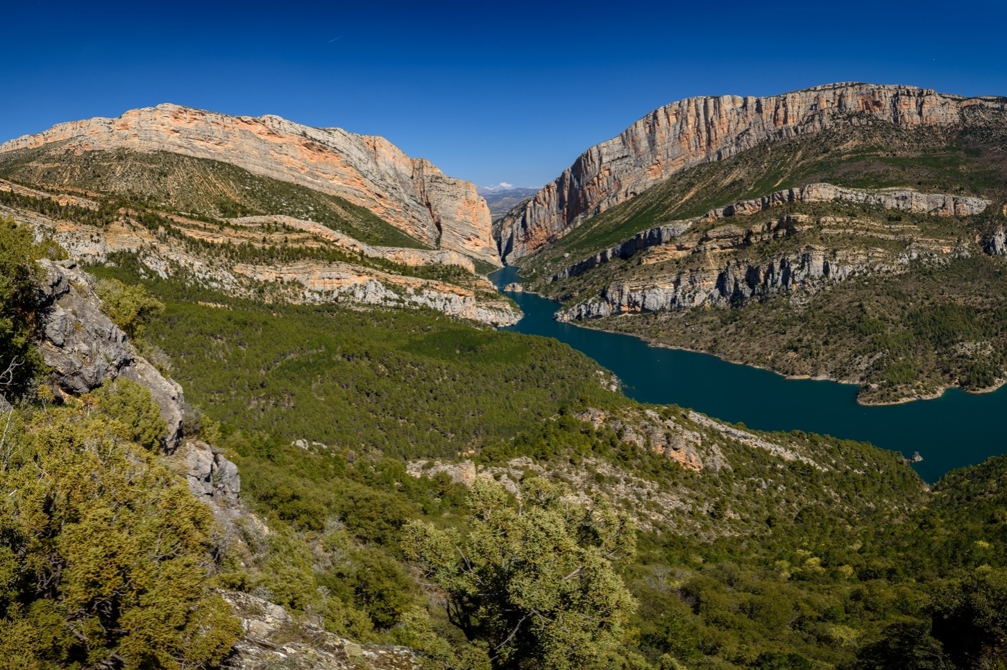 Baixem doncs per aquest sender amb diversos esglaons de fusta fins a arribar al nivell del pantà de Canelles. Travessem l'embassament per un dels seus punts més estrets, el congost del Seguer, on s'hi ha instal·lat un segon pont penjant que connecta Catalunya amb l'Aragó. Des d'aquí, la vista del vessant sud del Congost de Mont-rebei és impressionant.
